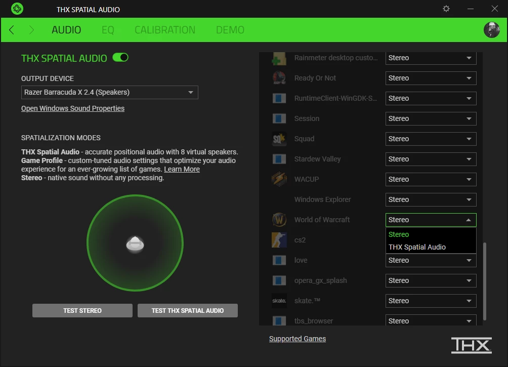 My understanding from the text on the left side of the THX window is there are supposed to be more profiles for supported games but all I ever get is “Stereo” and “THX Spatial Audio”.