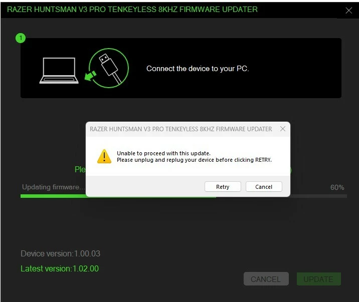 Someone please help me . I just got a Razer Huntsman V3 Pro TKL and it said it needed a firmware update so i followed the instructions and downloaded the updater. But when i press update ut goes up to 60% then stops and then shows a pop up saying “unable to proceed with this update”