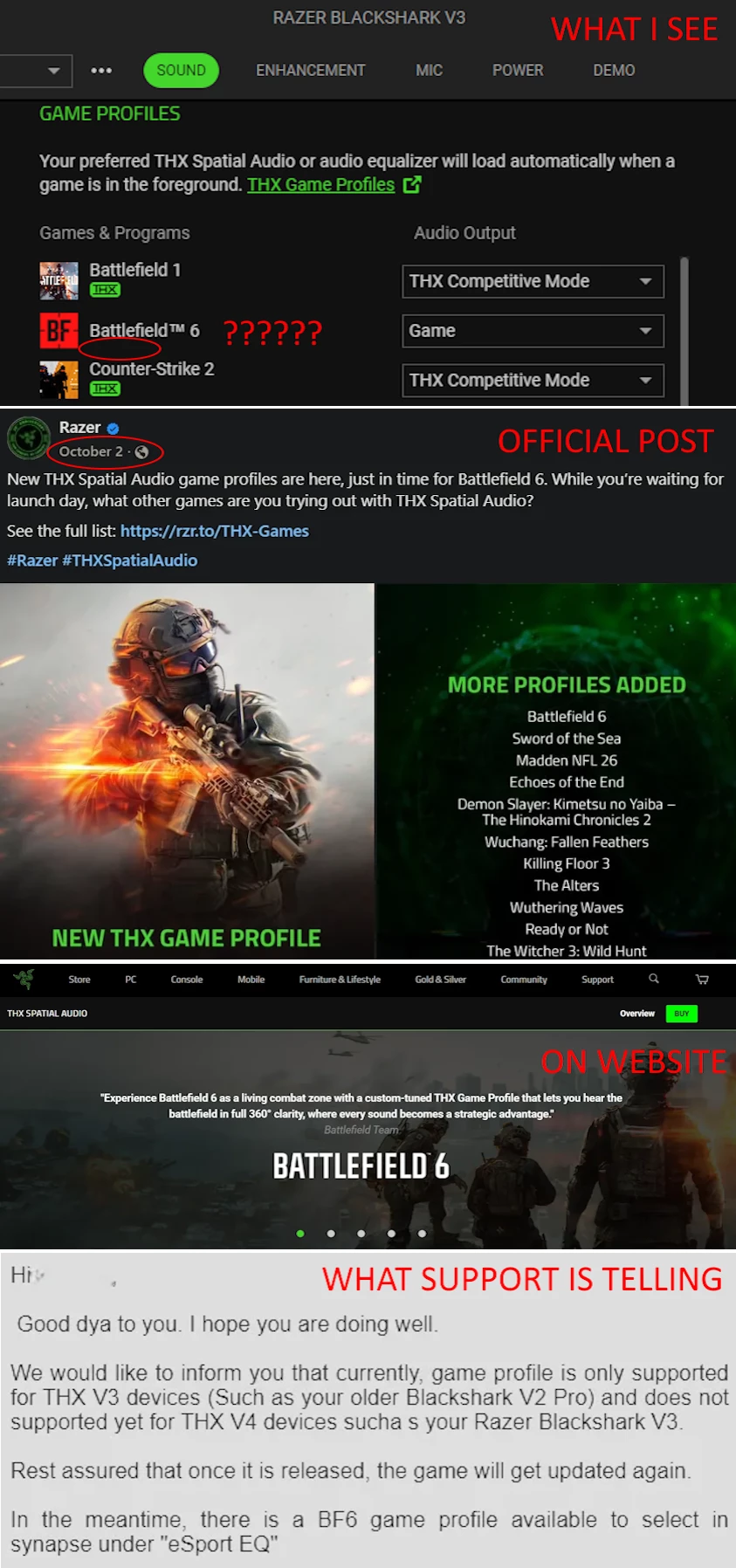 Just bought a Blackshark V3 headset and wanted to test out the THX Game Profiles for Battlefield 6. They posted on Razer official facebook page that it was added in October 2nd. I can’t activate it. I checked several posts on reddit and V3 owners have the same issue while the older headphones are working fine with the THX profile. This is false advertising and I want to ask ,what are you waiting for RAZER TO ADD IT FOR YOUR NEW HEADSETS!!! THEY WON’T FIX UNTIL ENOUGH PEOPLE COMPLAIN ON SOCIAL MEDIA. What incompetence!!