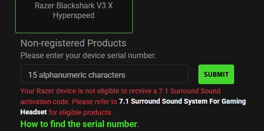 I bought the Razer Blackshark v2 X, but I can't get the code for 7.1 surround sound. I registered the headphones, and the system says that the code will be sent to my email, but it's not there, not even in the spam folder. I've requested the code about 10 times, but it's been a day, and I still haven't received it. I haven't used Razer products before, and because of that, I don't understand how to contact technical support, as there are answers to already asked questions everywhere. Is there another way to get my 7.1 sound code?