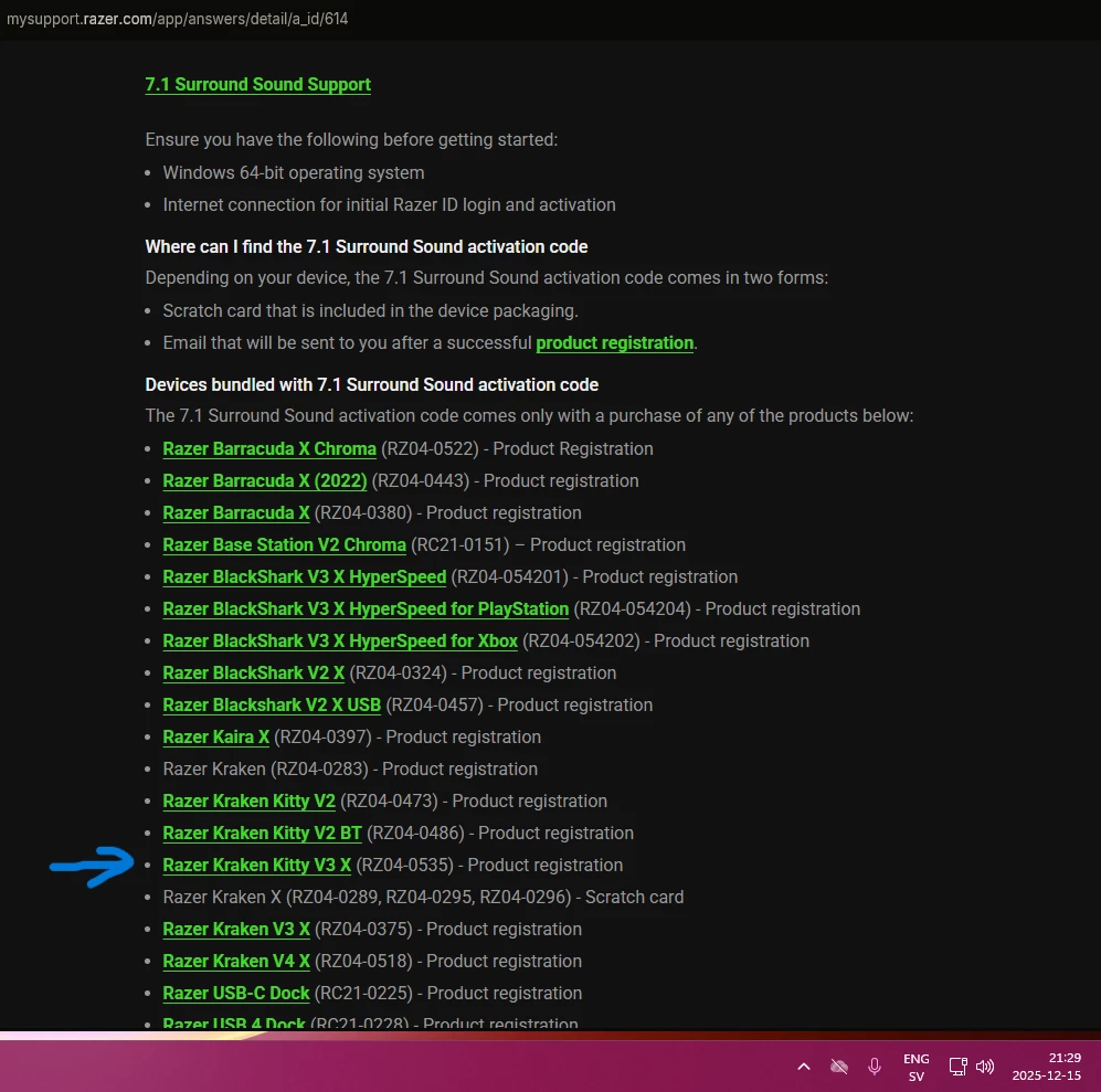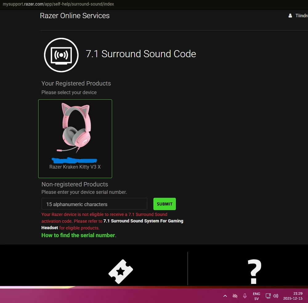 I bought the Razer Blackshark v2 X, but I can't get the code for 7.1 surround sound. I registered the headphones, and the system says that the code will be sent to my email, but it's not there, not even in the spam folder. I've requested the code about 10 times, but it's been a day, and I still haven't received it. I haven't used Razer products before, and because of that, I don't understand how to contact technical support, as there are answers to already asked questions everywhere. Is there another way to get my 7.1 sound code?