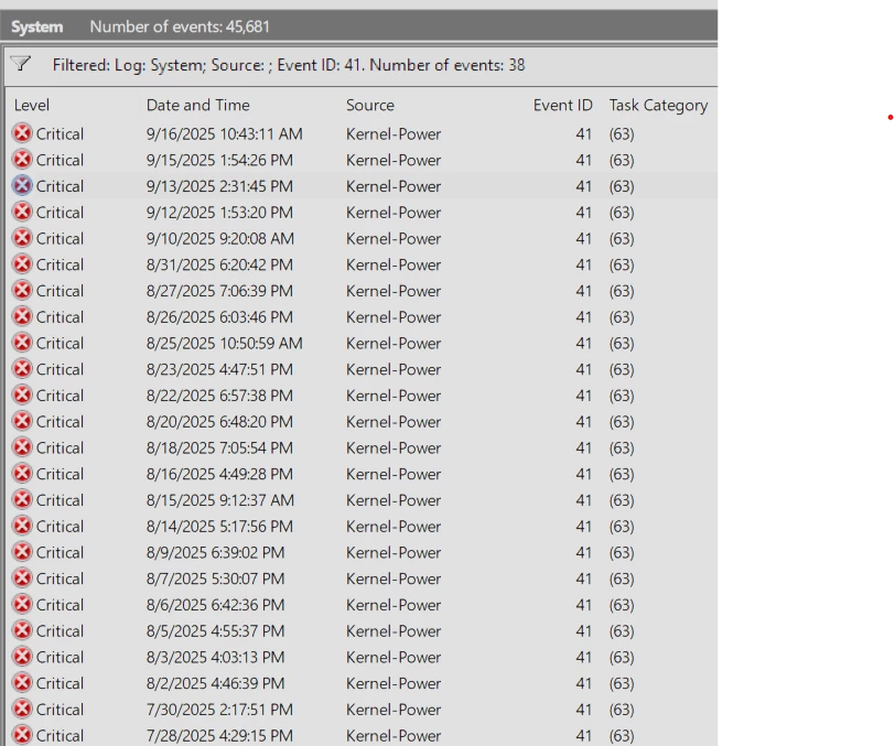 If I check into each one of these I find some with no BugCheckCode (meaning the crash happened too suddenly for windows to register its cause) but others with a variety including 59, 80, 275, 278, 307, 268435582, and more. 45k crashes in 3 months.