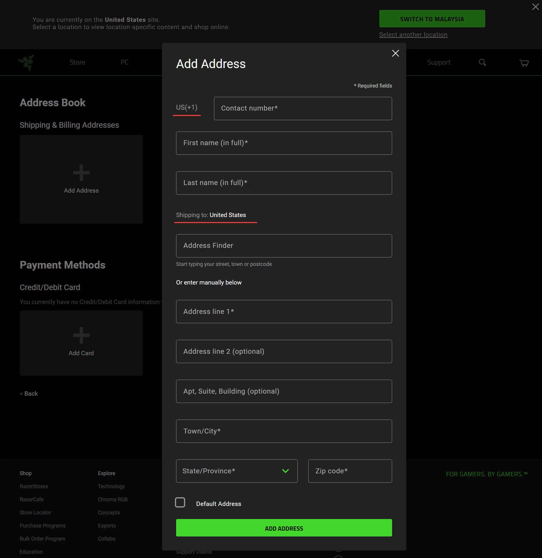 Hi! I'm interested in the Blade 18 when it restocks. I'm based in Malaysia, and the Blade 18 laptop doesn’t seem to be available in the Razer Malaysians store. I'm wondering if I can order from the US store and have it shipped to Malaysia. According to your FAQ, Malaysia is a supported destination. However, as shown in the attached image, it seems I can't add a non-US address to my profile.