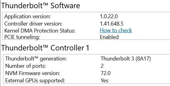 In device manager and Devices and Printers I see the Core X, but I don't see any indication Windows is seeing the GPU. If I go to the Thunderbolt Control Center, I see no attached devices and the info attached.
