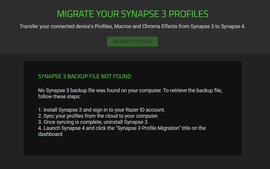 Make it make sense? I did the mistake of having wishful thinking of updating to Synapse 4 for its improvements, and it’s telling me that it doesn’t detect any previous profiles and saves. I clicked the migrate profiles button in the top right tab and guess what? It tells me to log into Synapse 3 and save my profiles so I can import them. Would be absolutely fantastic if you COULD download Synapse 3 and not be forced to download Synapse 4 with every single search of Synapse possible. Love having to fix something that never needed to be fixed in the first place… Least you could do is have the option to download the previous versions if you're going to even suggest this as a possible solution.