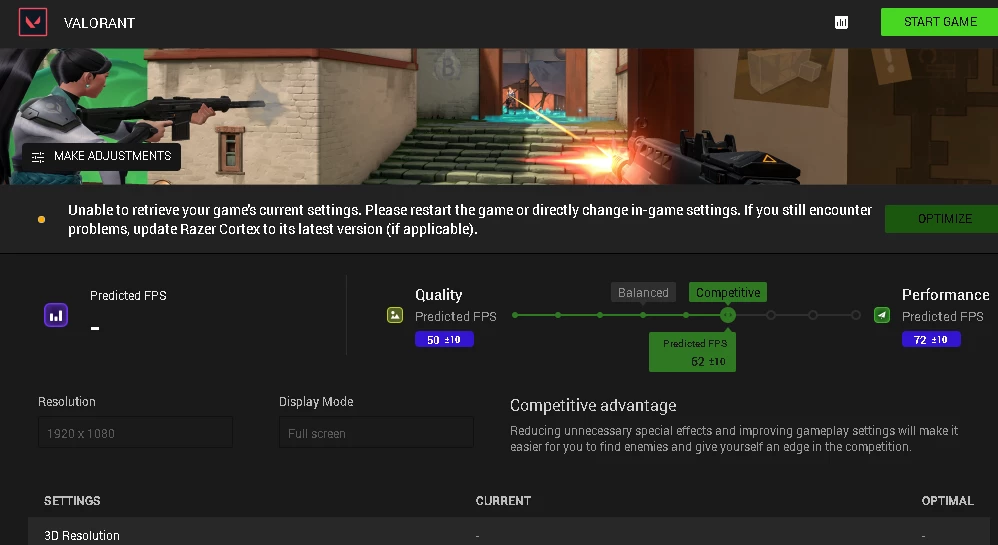 When i try to optimize valorant in Razer Cortex, it keeps popping up with "unable to retrieve my games current settings" please help to fix. Im on a low end laptop