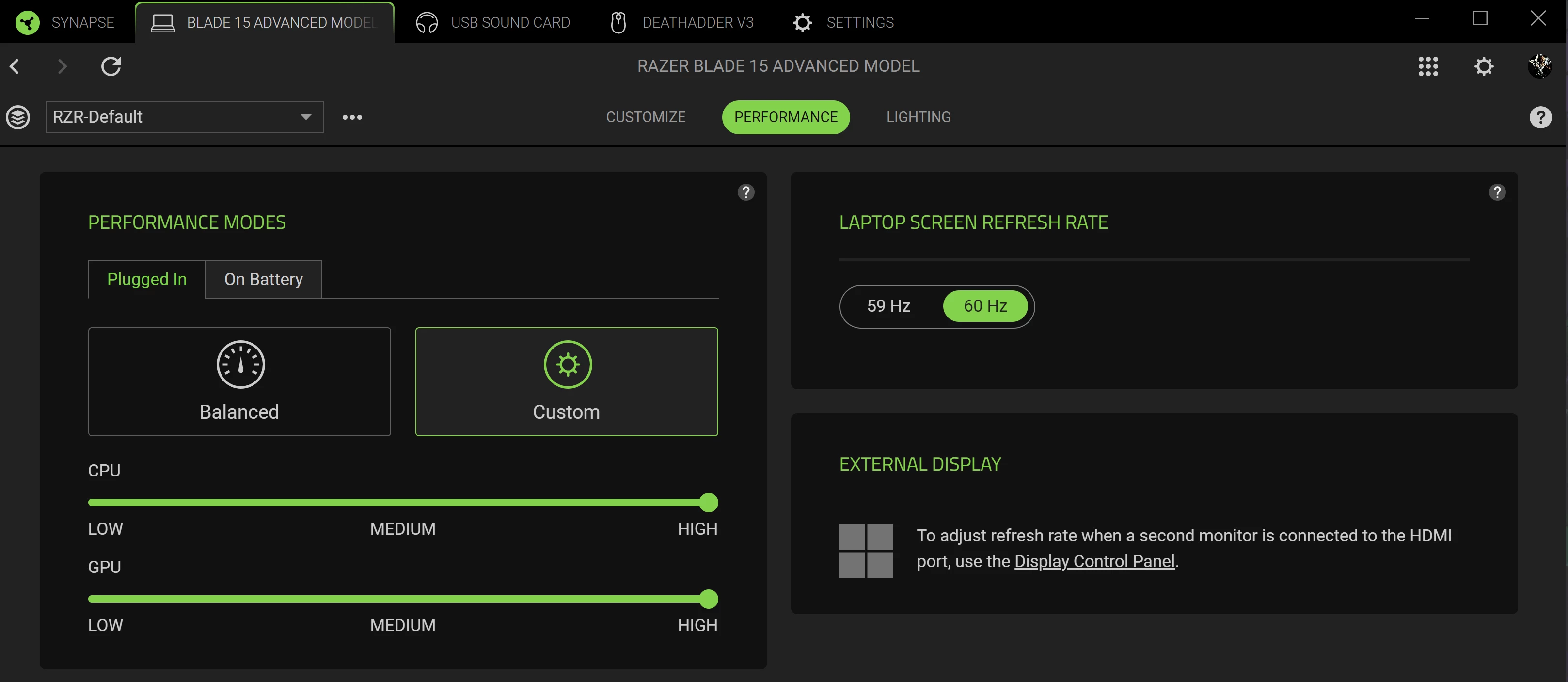 Razer Synapse 4.0.86 runs in the background. In its performance settings, Custom mode is selected and all sliders are turned to maximum.