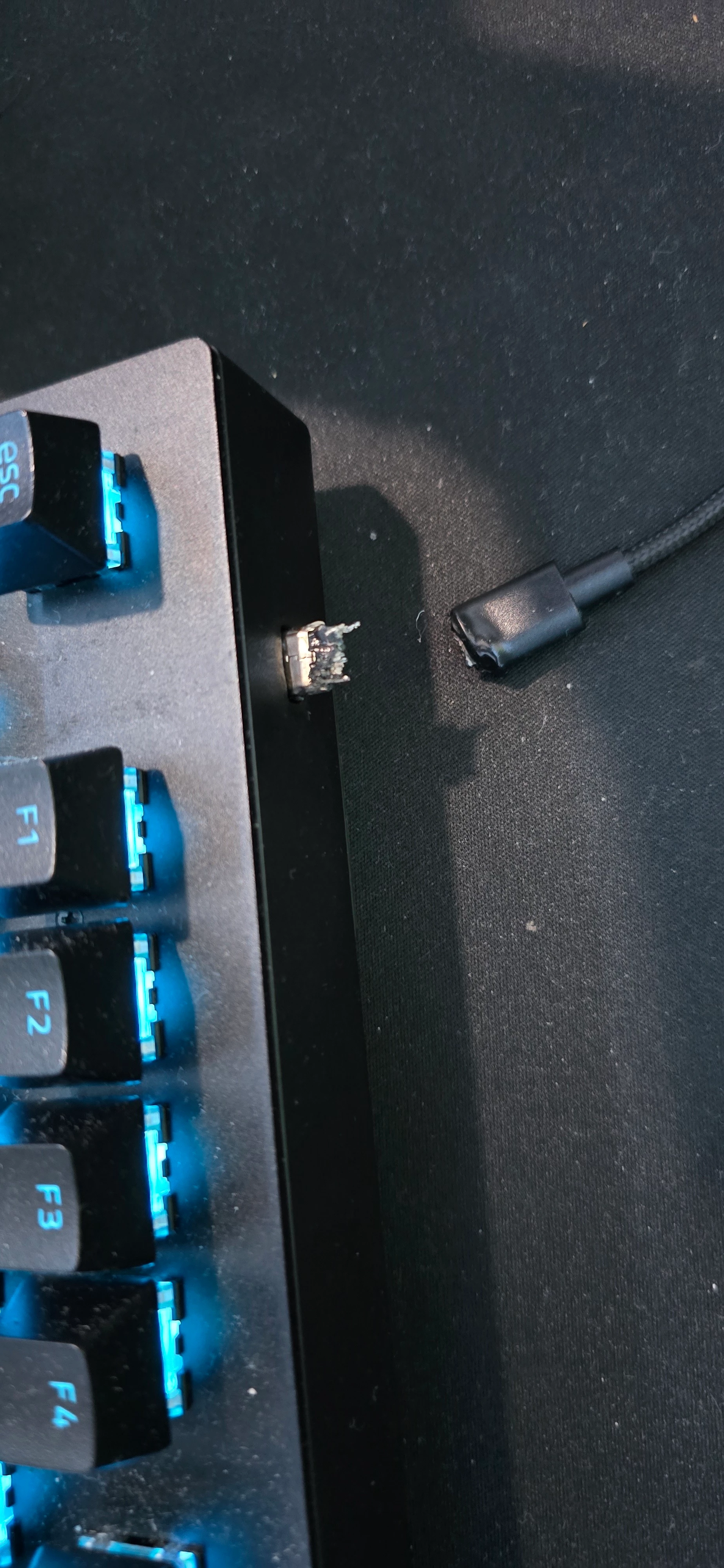 I left my keyboard plugged in overnight to charge and woke up to this in the morning….i am using the oem cable cplgged in directly to my laptop….. i have no idea how this happened as this is something i do every night…. i dont even understand how??!! because i have been doing this for the past 2 years without issue…. its the oem cable and everything….. the keyboard still works but i have no way of charging it again!!!!….what do it do….?