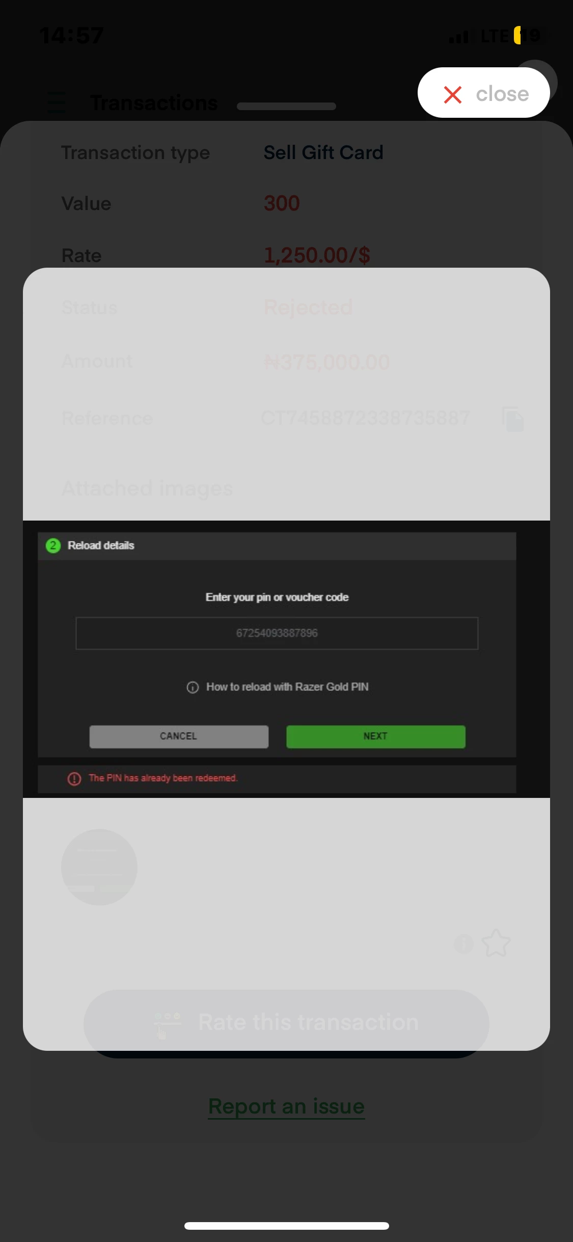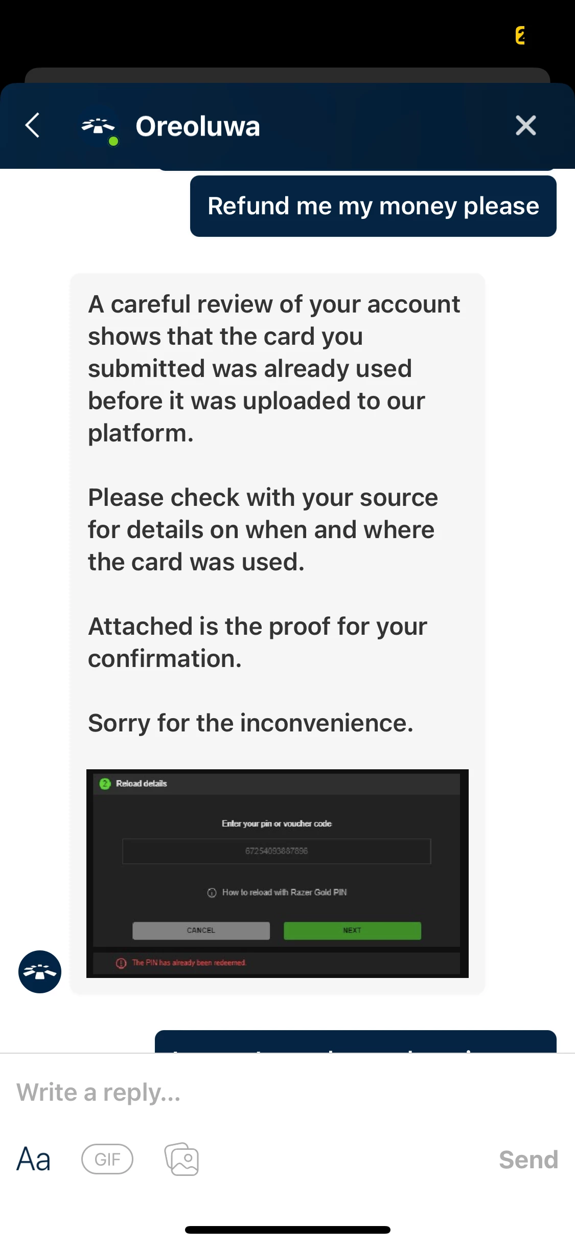 Unfortunately, I have limited access to this part of our system. Please submit a ticket or contact our Razer Gold Team via Live Chat by clicking the green chat button at the bottom right to get this sorted out in real-time. Please make sure to include all relevant information and photos of the card with an over-scratch code. Kindly ensure to follow the specifications as below: