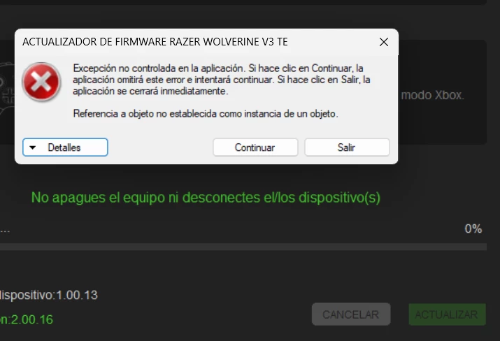 I have a problem with the firmware of the Wolverine V3 Tournament. I followed all the steps as indicated, but this error appears and I cannot continue with the installation. Has anyone else experienced this and knows a way to solve it?