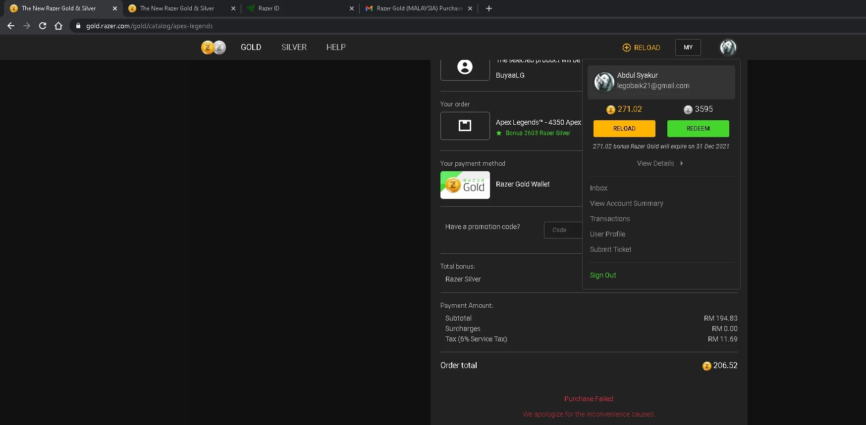 Does anyone know why when i purchasing apex legends 4350. It said purchase failed. Try several times ( 2-3 days ) still cannot proceed eventhough i got enough balance to buy it. Please assist on this matter. Thanks