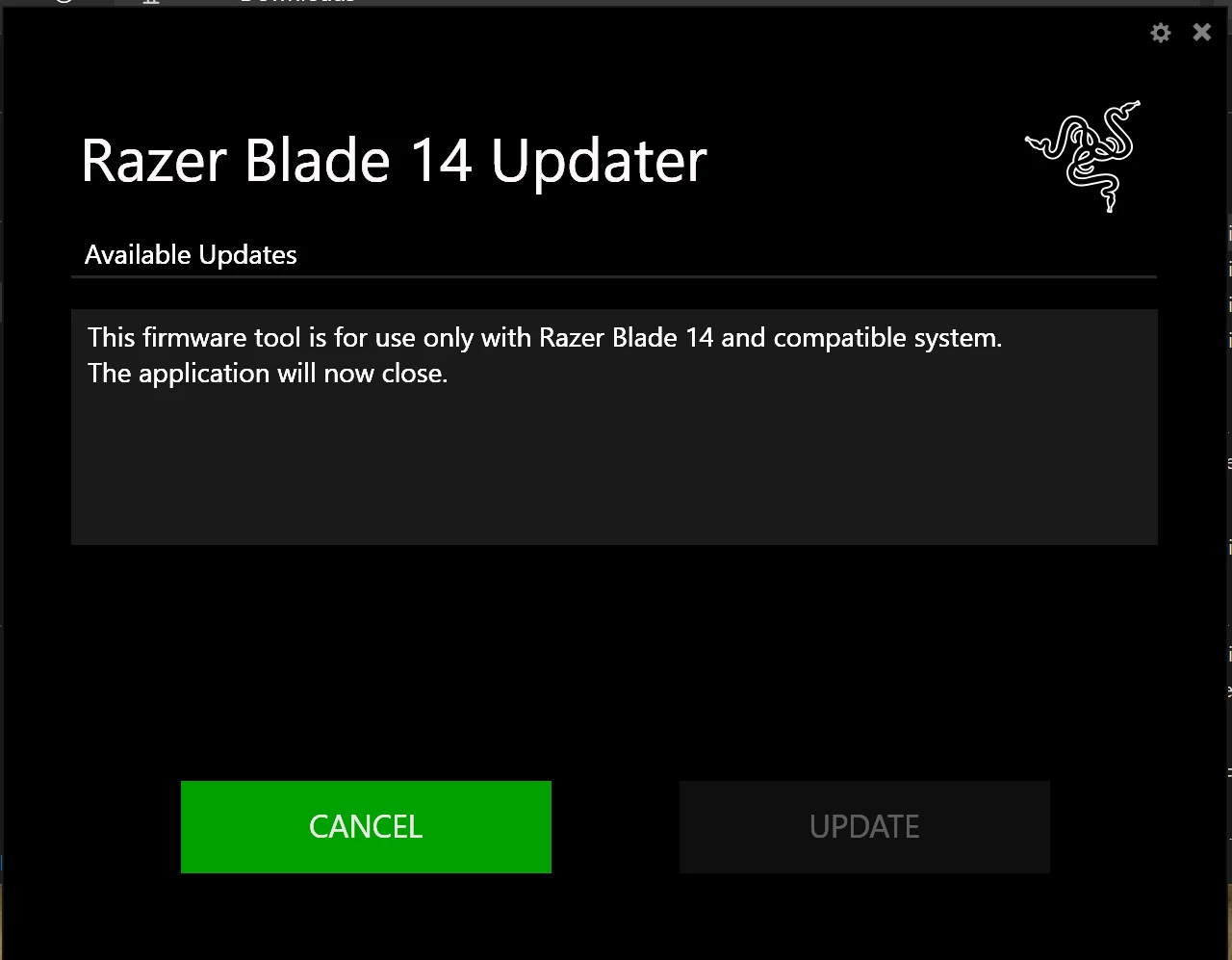 “This firmware tool is for use only with Razer Blade 14 and compatible system. The application will now close.”