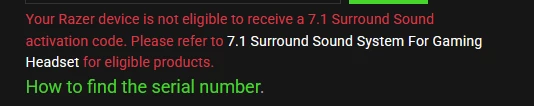 Your Razer device is not eligible to receive a 7.1 Surround Sound activation code. Please refer to 7.1 Surround Sound System For Gaming Headset for eligible products.