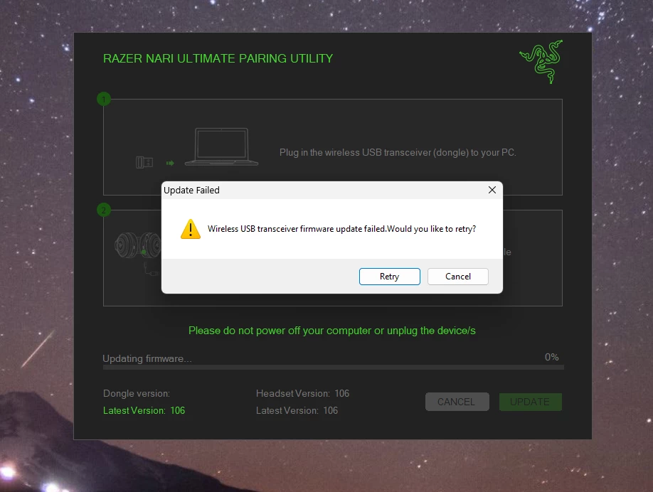 I have a pairing issue, and this error appears ( Wireless USB transceiver firmware update failed )