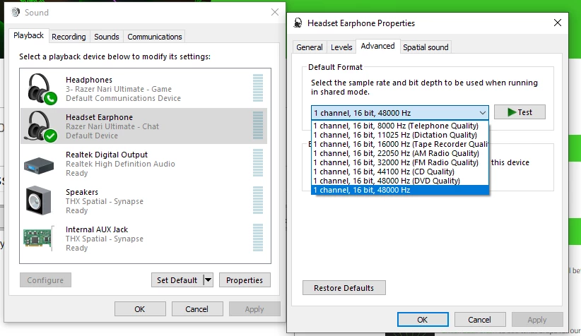 On the second one (razer nari ultimate game) i have the option for 2 channel but the sound with them is very low even when my head set and windows is on max i can't hear a thing