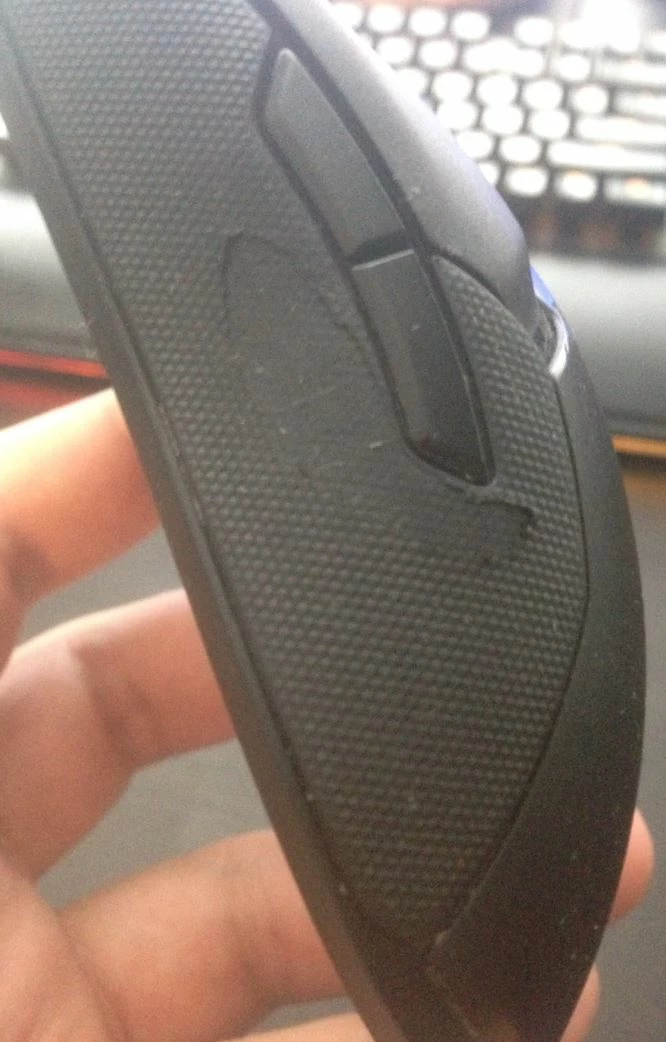 I dont even talk now about rattling and creaky sounds of this mouse, but now my rubber grip peels off, just look at this