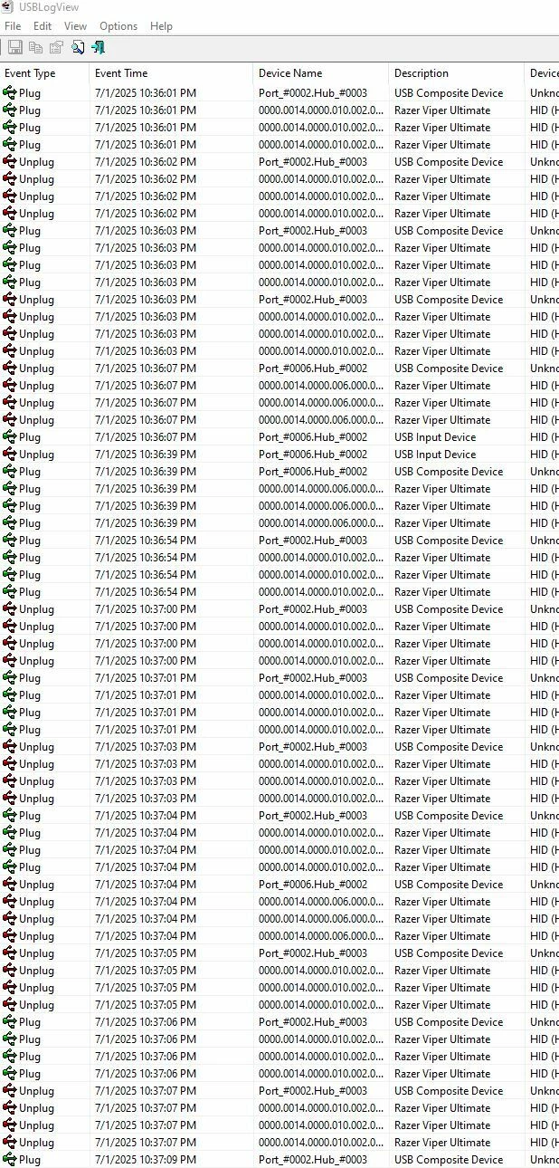 Also may refer to the picture below which show the USB log showing the USB keep on connect & disconnecting.