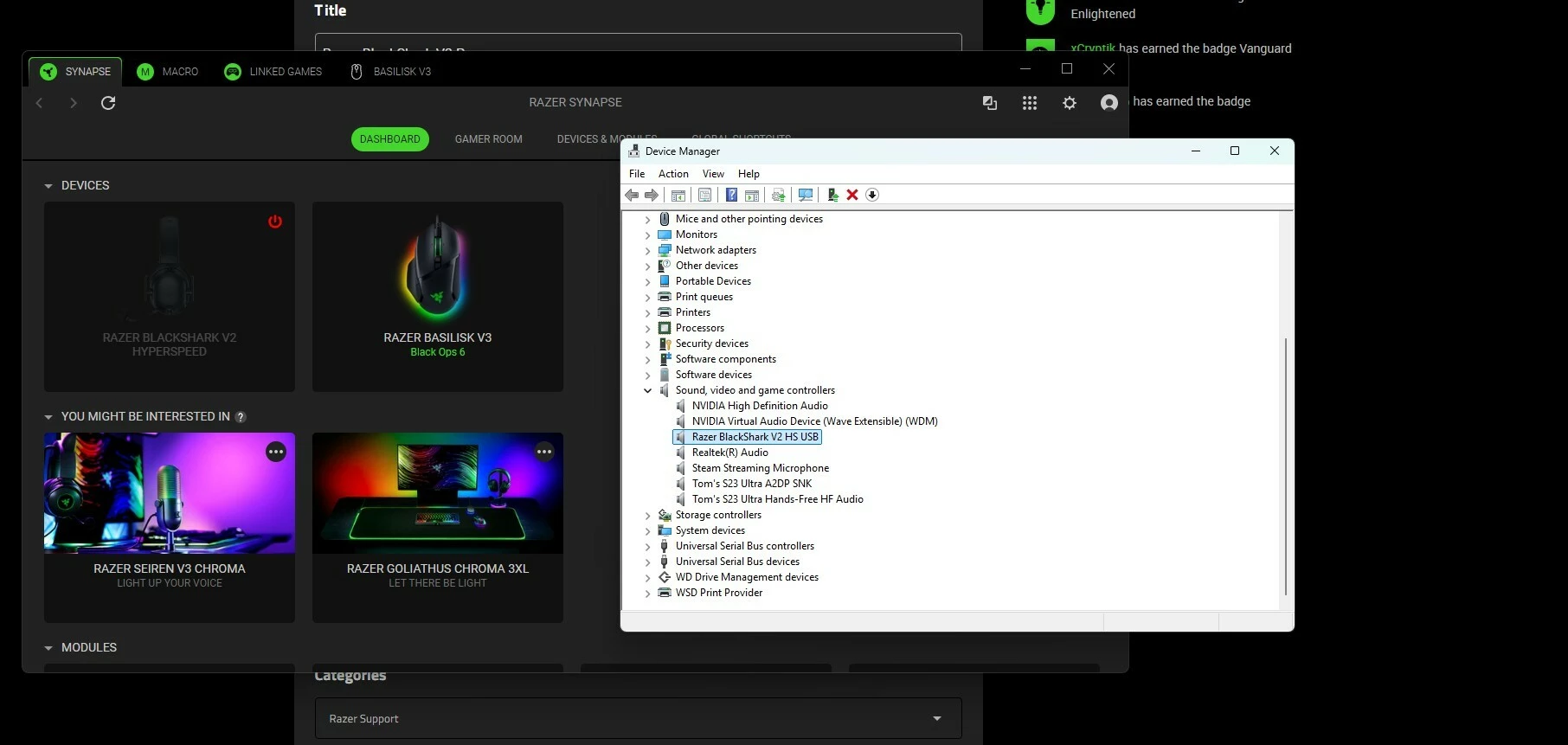 My Razer Blackshark V2 Pro (2023) stopped working after I got home today despite working entirely fine yesterday. I have already tried plugging back in the USB, restarting my computer, reinstalling Synapse latest ver. and drivers with no luck. even ran the Tool.