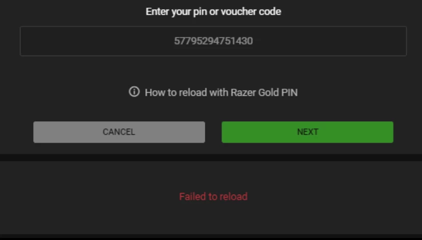 Hi there please I really need help I got a Gold pin giftcard two I used one its worked worth $500 I tried reloading the second one I got and error messages saying fail to Reload
