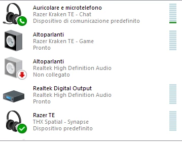 Hello everyone, after the Synapse's update it is all broken. I can't hear through the device: "Razer TE (THX Spatial - Synapse)" after the update. I set it as default playback device but i am still hearing the audio from the device "Razer Kraken TE - Chat" (devices screenshot). Because of that I can't use razer synapse's feature: I can't use the equalizer, sound profile, thx spatial audio. I try to unistall and repair the software but it doesn't help me. When I move equalizer's settings nothing change. I am using Razer Kraken TE. Can someone help me? Sorry for my english