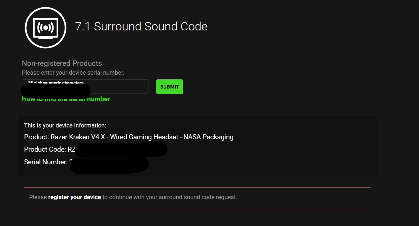 Hello! I am writing this to report that I am unable to register the razor kraken v4 x I purchased today. Thus, I can’t use the 7.1 feature.