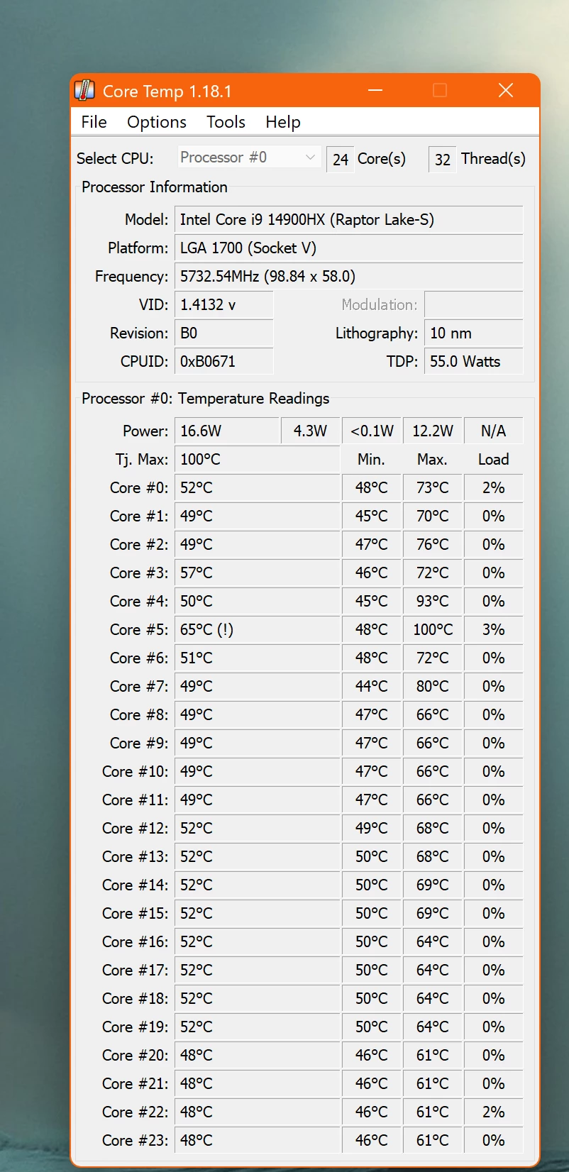 I’m experiencing an unusual thermal behavior on my Razer Blade 18 with the Intel Core i9-14900HX processor. While monitoring CPU temperatures using Core Temp, I noticed that Core #5 reaches 100°C, even though the laptop is idle or under minimal load. The rest of the cores remain in a much lower range (around 48–57°C).