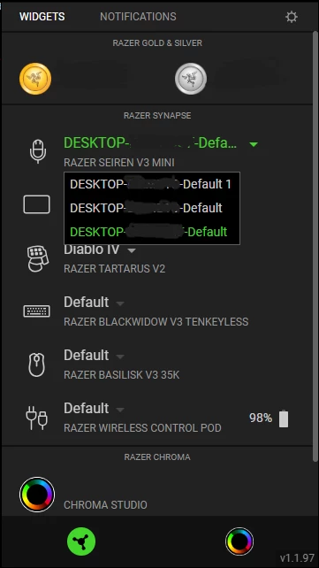 I use a Seiren V3 Mini. In Synapse 3, you can change, add, rename, delete profiles, but not on Synapse 4. So, it is a missed feature. Currently, I have 3 profiles shown in the system tray widget for the mic from my PCs (as shown in the picture), and I can switch profile from there, but not in the app itself. And change, rename, delete, add profile function aren’t present in the app.