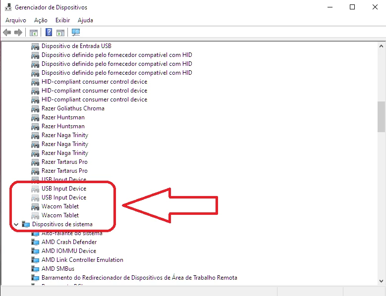 The device manager displayed a huge number of devices with faded colors (devices not in use, see screenshot below). Among them were many faded replicas of my Razer Huntsman and Razer Naga Trinity.