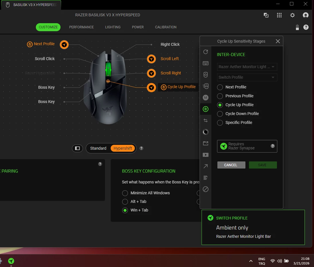 I have a Basilisk v3x hyperspeed mouse and a Aether Monitor Light Bar. Had them around for 2 years. I’ve 5 lighthing profiles in my Aether Light Bar, and set a mouse button to “Inter-Device > Cycle Up Profile”(see img).  Up until this update clicking the mouse button cycled between light profiles properly.( profile 1> profile2 > so on)