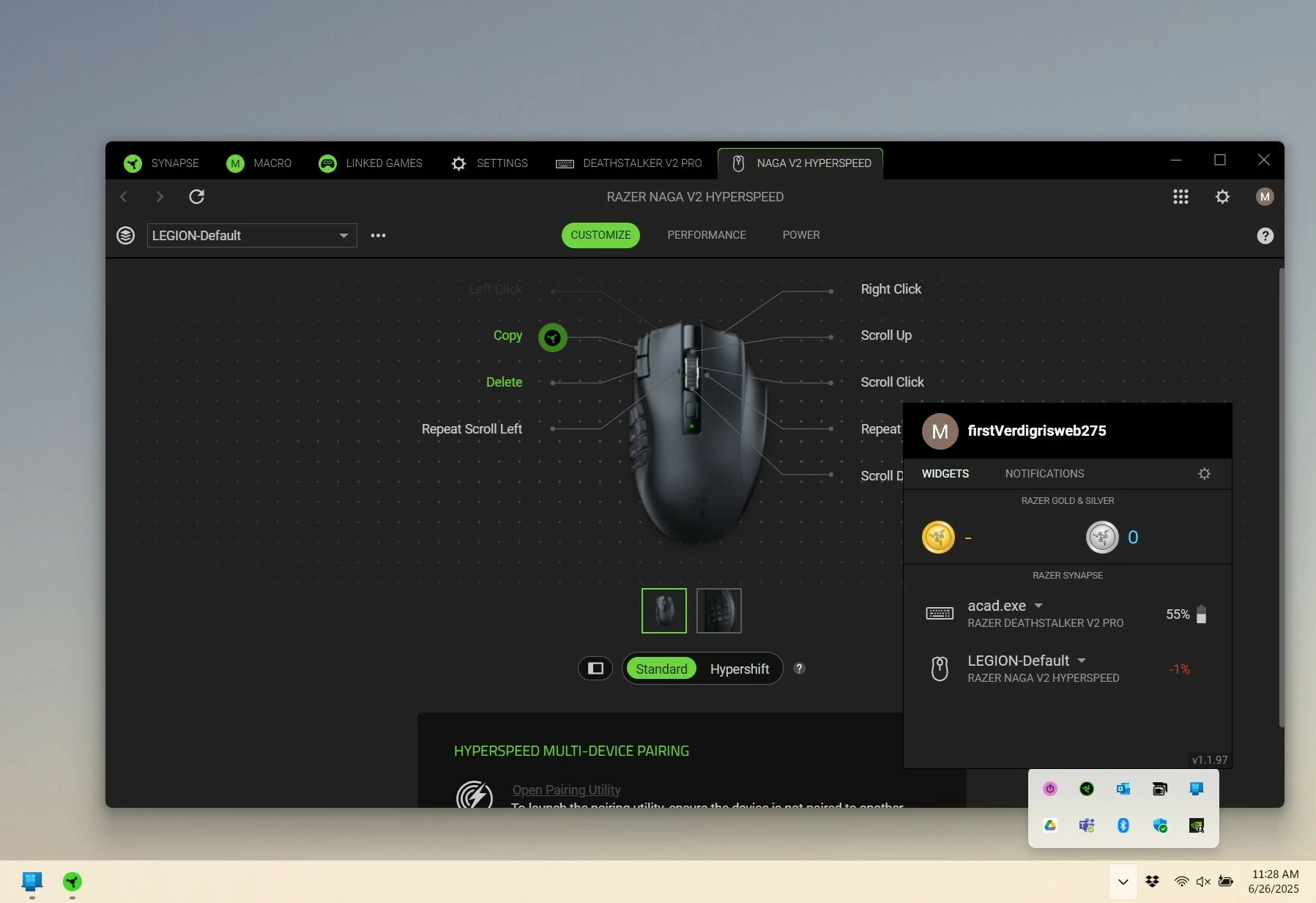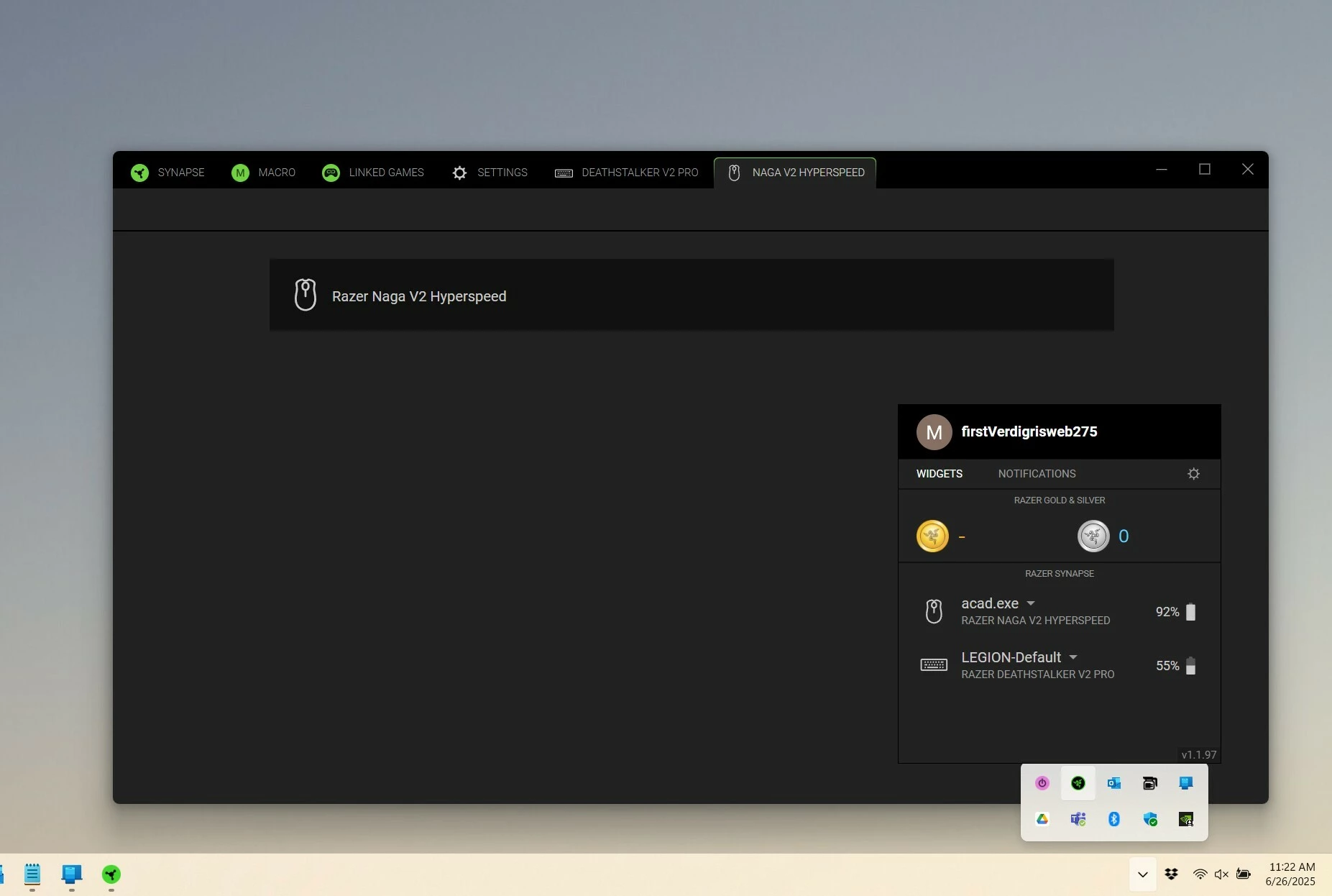 I was having no issues with just my Naga V2 Hyperspeed mouse, but now that I've added a Deathstalker V2 keyboard, I find that Synapse frequently loses its connection with the mouse (as seen in the first screenshot). Then I restart Synapse and it regains the connection (second screenshot).