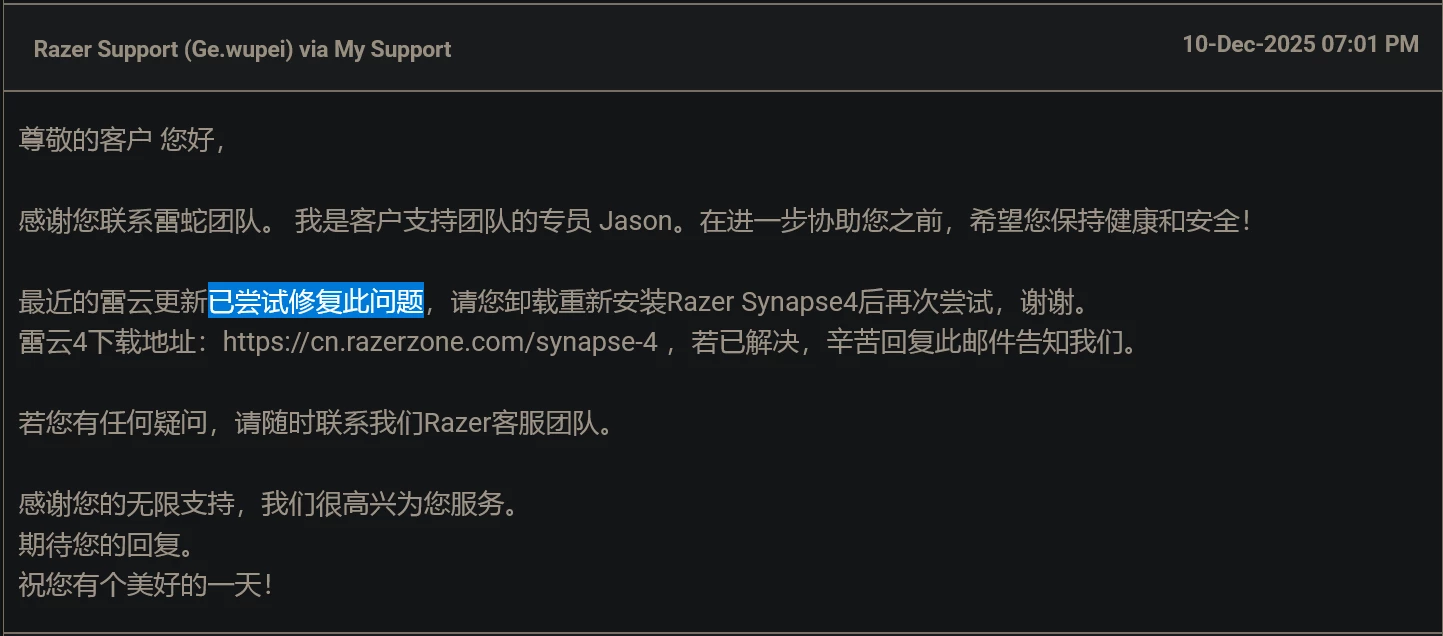 By the way, last month (10-Dec-2025) Razer Support staff replied me that they tried to fixed.
