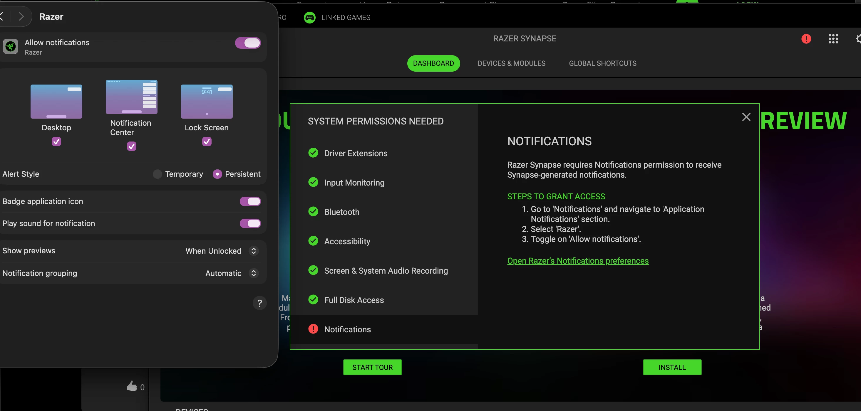 Yep, I have the same issue. Just installed Synapse on my M1 MacBook Air running Tahoe (26.0.1). All the other permissions are registered correctly, but Notifications shows the red exclamation mark no matter what’s selected in Settings. I haven't been using the software long enough to know whether the notifications are coming through despite it thinking they’re not enabled. It’s certainly an annoyance having to close that dialogue every time I open the app.