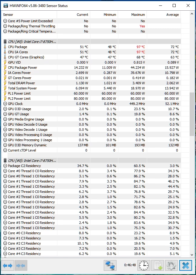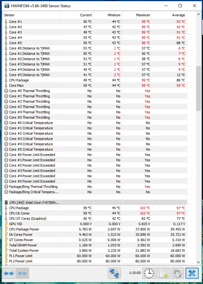 I still get all 6 cores to thermal throttle, though now I don't see any PL throttling according to XTU. HWInfo64, however, shows Core Power Limit reached on all 6 cores.