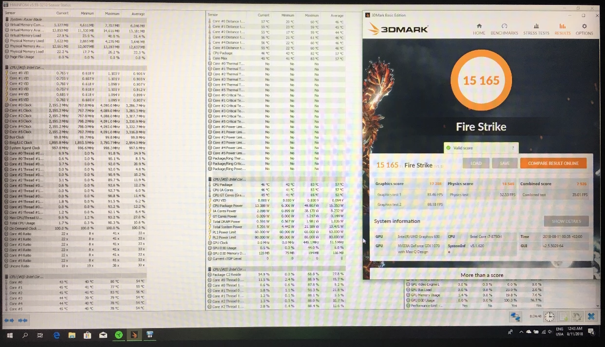 GR8-RideI believe there’s power limit throttling but on that screen I couldn’t fine any that shows it. It’s more thermal throttling proof. I never use default setting, always undervolting my Blade, but I’ll check. Though for doom i think it’s too high even on default. How high is ambient temperature? Power limit throttling can be solved with bios tweak like on gs65, but for avoiding such thermal throttle I think Razer lock it. Even seems every laptop not only Razer has various temperature. Note that Blade 15 gpu outperform other maxq laptops because gpu wattage is higher. With proper cooling and “right device“ Blade 15 can perform similar with full 1070 laptops. Source: me.