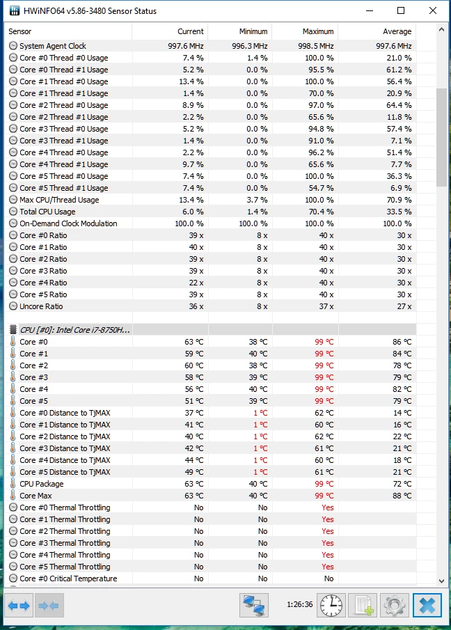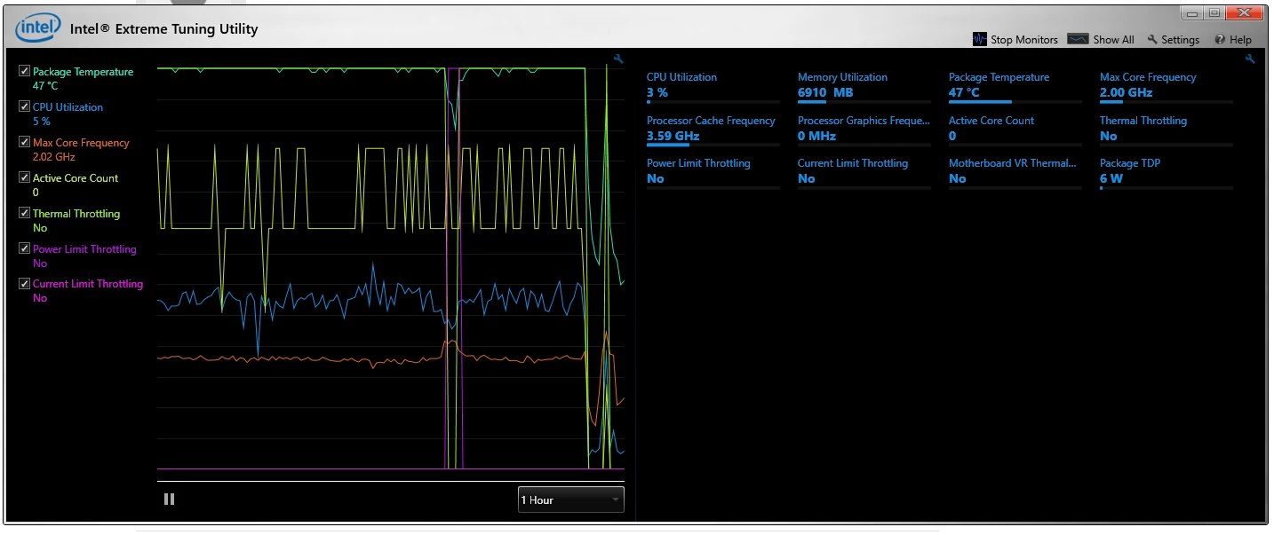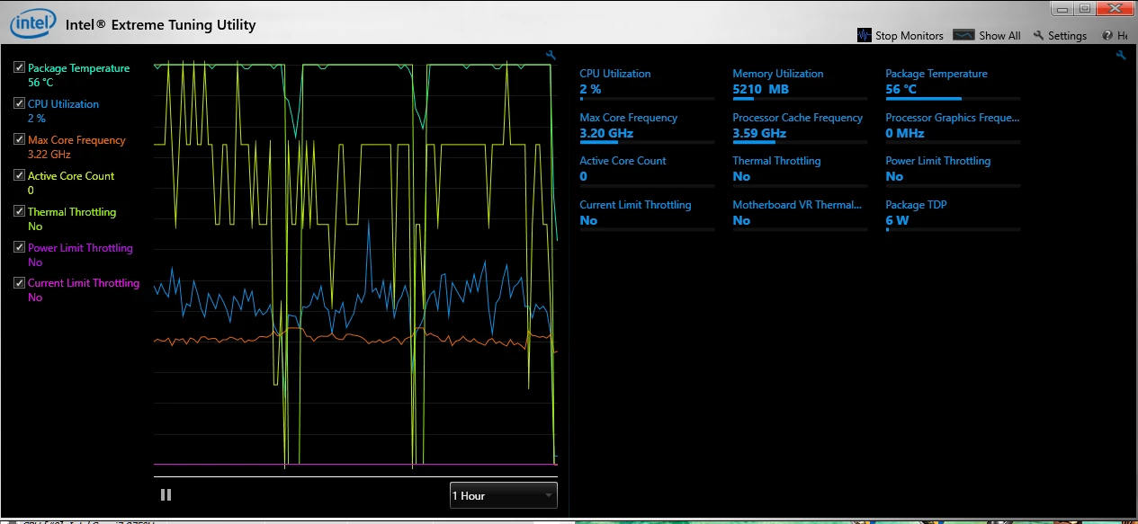 Running through the graph on XTU, it's interesting to see that my Package hits 100C a bunch of the time, yet CPU utilization is only about 40-60%.