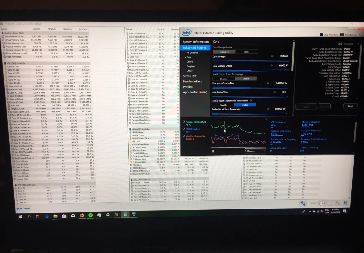 Anyone should have it;) I’d like to share but now I let my Blade take his summer vacation at home after finishing Far Cry 5:), I’ll be back next weekend, I think till then someone should sharing that. I believe it’s unlocked somehow to throttle to 45 Watt on gaming mode and 35 watt on balanced mode after around 10 second on higher wattage, correct me if I’m wrong. I think they make it to keep lower temperature and quite Fans for Blade longevity, I wonder if the cpu could stay longer on high frequency, it’ll easily get full gtx 1070 laptops, since gpu performance is already blown away other maxq 1070 laptops, well at least on mine.