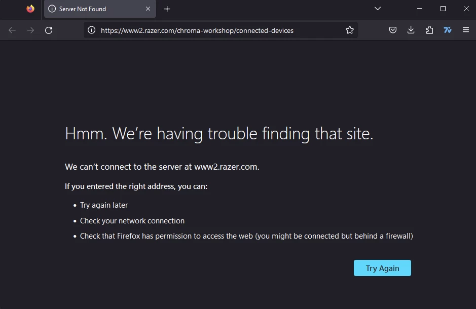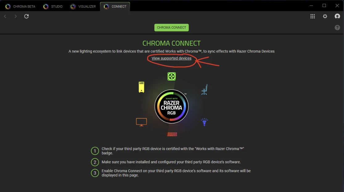 In “Razer Chroma Beta → CONNECT” which brings up the “CHROMA CONNECT” window, there is a link to “View supported devices” however this link comes up to a “Server not found” page.